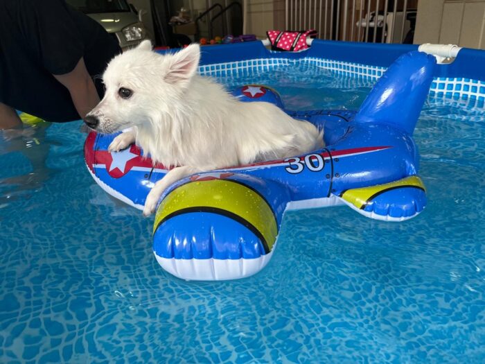 ↑犬用プールに行ったとき。飛行機浮き輪に乗るのが非常に上手!天才だね